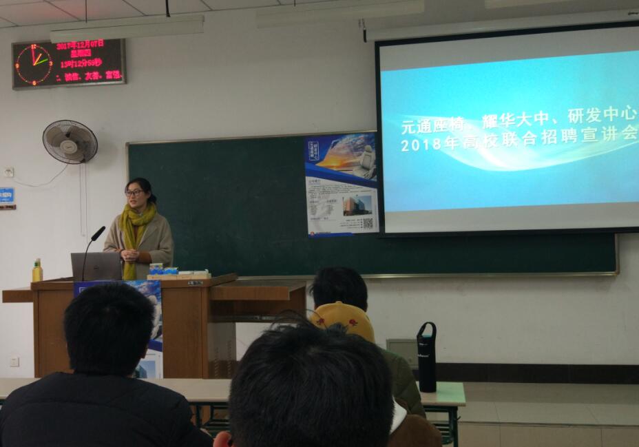 2017年12月7日下午13:00,十大买球官方网站在2105教室举行了上海元通座椅系统有限公司宣讲会。上海元通座椅系统有限公司人事经理沈伟萍、十大买球官方网站辅导员李陆嫔以及毕业班部分学生等参加了宣讲会。