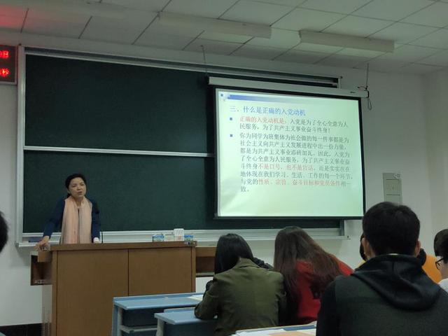 王老师主要从四大部分来给同学讲解,分别是第一部分:树立正确的入党动机;第二部分:自觉接受党组织的培养和考察;第三部分:争取入党要正确处理好八种关系;第四部分牢记历史使命,坚持“四个统一”。