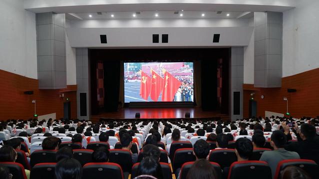 升旗仪式结束后,十大买球官方网站留校学生前往大学生活动中心报告厅观看中华人民共和国成立70周年大会直播。大学生活动中心报告厅十大买球官方网站区域座无虚席。观看庆祝中华人民共和国大会过程中,各位同学紧紧跟随大会进程,高唱国歌,向国旗行注目礼。同时十大买球官方网站也通知学院老师收看大会直播,在学院微信群里,各位老师晒出自己观看电视直播、通过学习强国收看直播的照片,通过微信小程序争做升旗手等活动,表达自己的爱国之情,共同分享强大祖国的成就,共享新时代的荣耀。