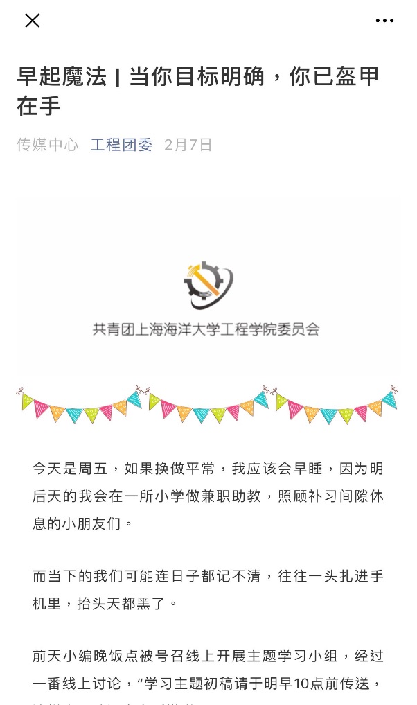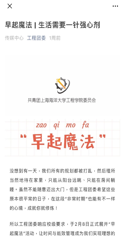 2018机制1班的代一铭同学提到,这是迄今我经历的最不平凡的时光。偶然的机会在同学的朋友圈看到“早起魔法”活动的推送,一群渴望自我管理时间的同学聚在一起互相督促早起、使用to-do list,晚上结束前还有学姐分享“长期坚持使用效率手册”的成功经验。起初我并不在意,但是看到越来越多的同学在群里坚持不懈地以全勤的态度参与活动,我内心是惭愧的,这迫使我重新思考“时间对于我们来说到底意味着什么”、“如何今天使我们生命的最后一天,我们会遗憾吗”。“早起”称不上一种魔法,不让时光在我们掌间虚无地溜走,才是我们一生需要学习的。