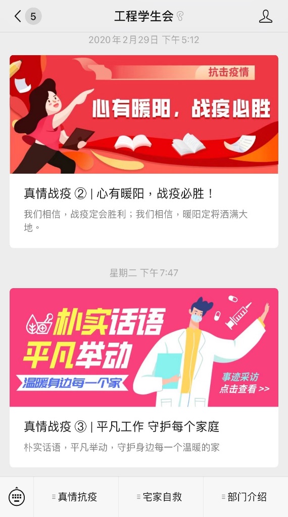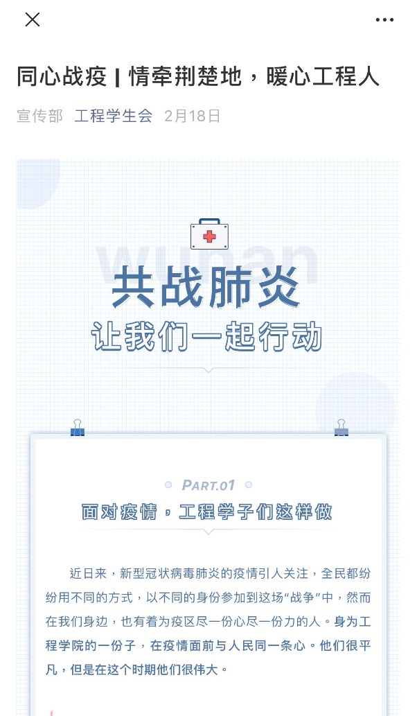 在这个开年,我们看到了无数逆行者的身影、听到了无数逆行者的故事,更明白了无数个人的一小步就是抗疫战线的一大步。学院杨琛老师志愿成为浦东新区陆家嘴街道的抗疫志愿者,巡逻检查梅园片区26个小区和诸多复工公司;叶杰民、夏长春、桑成松、冯江伟等研究生党员和潘佳宜、蒋芳、凌泽宇、李荣等几位本科同学,主动加入家乡社区防疫工作,讲述防控知识,守护入村站点,真情奉献防疫。还有更多的师生加入到捐款捐物行列中,心系荆楚,联系多方基金会并积极供应防护物资,为湖北和家乡多方奔走。工程人在这里挺身而出,用行动、奔走和热血,铸造抗疫的坚固屏障,向我们诠释着勇担当、善作为的雷锋精神。
