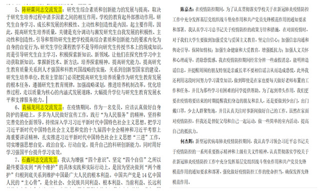 研究生第三党支部冯凯亮同志交流发言说:“到目前我们疫情已经得到了很大的改善,中国的经济也在快速的复苏,作为一名中国人,作为一名共产党员,我相信中国有能力战胜疫情,并且在年末可以实现全部脱贫的目标,即中国将进入全面小康社会。在看到这次疫情中的有很多90后的身影,说中国发展的重任也即将落在这一代人身上,我内心有很大波动,自己一直在想,我以后能为社会做出什么样的贡献呢?”研究生第三党支部成员顾旺旺同志在交流发言时也表示,党员要做到不忘历史,不忘初心,知史爱党,知史爱国。加强学习,提升自己科研能力,为开学做好准备。要听从学校安排,服从指挥,不提前返校,以防造成不必要的麻烦。研究生第三党支部党支部书记秦昊也对各学生党员提出几点要求:一是提高政治站位,认真学习贯彻习近平总书记关于坚决打赢疫情防控的阻击战重要指示精神,自觉服从、支持学校疫情防控工作的各项安排;二是认真上好网课,合理安排时间,加强身体锻炼;三是作为党员,更应该严于律己,正身垂范,带头组织好、落实好各项防控工作具体要求。