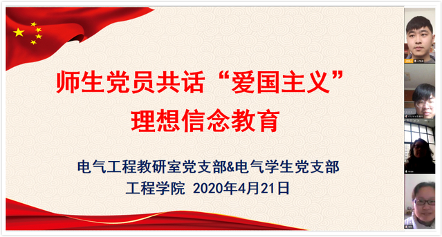 为进一步巩固“不忘初心、牢记使命”主题教育成果,贯彻党的十九届四中全会精神,推动全体党员知史爱党、知史爱国,结合疫情防控工作实际,2020年4月21下午14:30,电气教研室党支部和学生党支部全体党员齐聚腾讯会议平台,开展师生共话“爱国主义”理想信念教育组织生活会。会议由学生党员江智清主持,学院党委副书记郑宇钧列席。