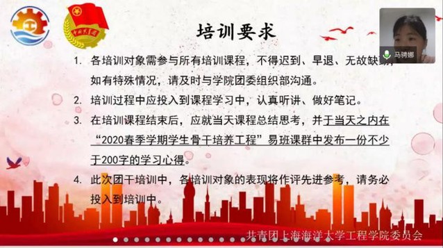 马骋娜老师首先介绍了本次培训班的基本情况,包括课程设置、培训要求以及时代背景。本次学生骨干培养工程结合《共青团2020工作要点》,在持续深化青年大学习行动、广泛深入开展青年制度自信教育、深入实施青年讲师团计划、深化青年社会主义核心价值观培育工作、深入推进青年马克思主义者培养工程、推动网络新媒体工作提质增效、丰富青年大学生文化供给、强化团干部理论武装等重要内容要点基础上,积极开展针对十大买球官方网站青年学生骨干理论素养和领导力提升的培育工作,旨在塑造一代又一代能够积极发挥示范引领作用的优秀青年。
