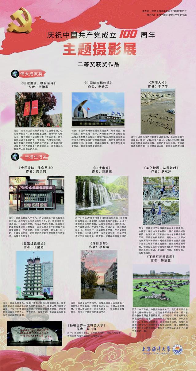 获得二等奖的是,幸福生活类:韩怡萱《不爱红装爱武装》、李宛晴《落日余晖》、罗双琴《美化校园》、王俞超《重温红色景点》、赵飞祥《扬帆世界一流特色大学》、赵顺康《山清水秀》、周贝妮《全民消防》;伟大成就类:贾怡欣《征途漫漫,唯有奋斗》、李学忠《东海大桥》、申皓文《中国航海博物馆》。