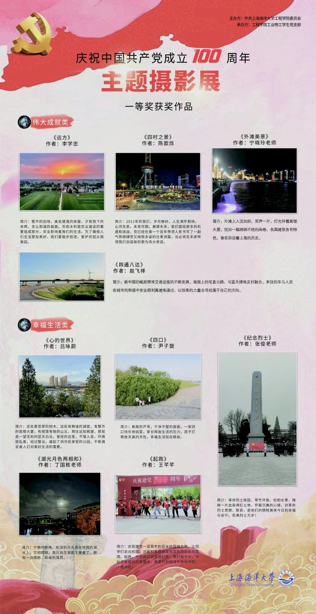为了庆祝中国共产党成立100周年,十大买球官方网站举办了建党百年主题摄影征集活动,参加对象为买球赛十大平台全体师生。本次摄影展分为两大主题:伟大成就类和幸福生活类。伟大成就类中作品系有关我国工农业发展、能源开发、生态保护、交通设施、民生改善等的摄影作品,包括以往不同时代的对比照片。幸福生活类系反映中国某一地区构建经济、政治、文化、社会、科技、人文、生态文明的小康社会,以及百姓在日常生活中所体现出的符合社会主义核心价值观的爱国敬业、诚信友善、崇德尚义、健康乐观的好人善行、文明益举、时尚新风的摄影作品。