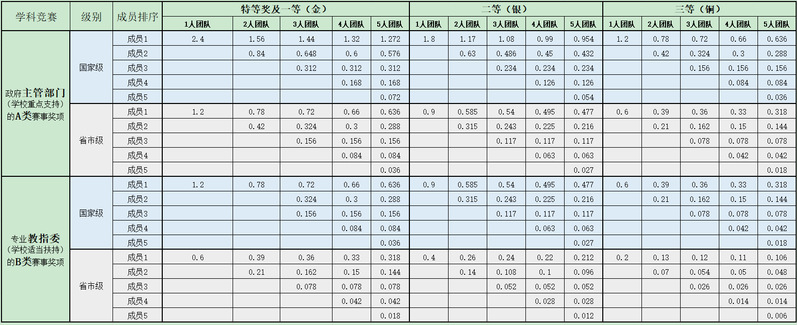 附表5:大学生创新创业活动及学科竞赛获奖团队成员加分对应表