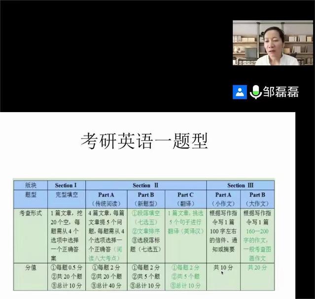 邹磊磊老师为大家详细介绍了考研英语分类、考研英语题型、基本的语法知识等内容。以考研阅卷人的视角,详细介绍了考研笔试英语中翻译与写作应该注意的事项及应对策略。在最后的问答环节,强调了复试中英语的重要性,并介绍了不同专业复试时可能遇到的题型。建议备考学生广泛阅读、开拓视野,提高自己英语成绩的同时,提升自己的英语素养。