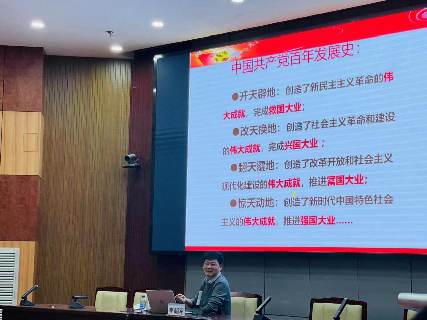 上海第二工业大学副教授李朝军博士带领大家深入学习了党的发展史,强调了学习党史的重要性和必要性。他强调:我们党的百年历史,就是一部共产党人为中国人民谋幸福、为中华民族谋复兴的奋斗史。我们学党史,不仅是为了牢固信念,更重要是要能看到这一百年来,中国共产党是如何发展、如何壮大、如何坚定不移地走群众路线,为人民服务的。他希望大家能够积极学习党史,并从中汲取智慧和力量,不断砥砺初心与恒心,在新征程上取得更远大的胜利。