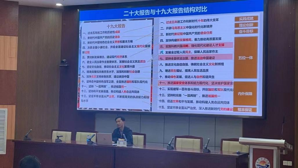 培训期间,徐帆老师向大家展示了二十大报告,他指出二十大报告是对过去五年的总结以及对未来的展望,并强调:青年学子要向二十大报告内容看齐,为党积极工作,将自身命运与国家命运相结合,坚定不移地推动国家繁荣与富强。