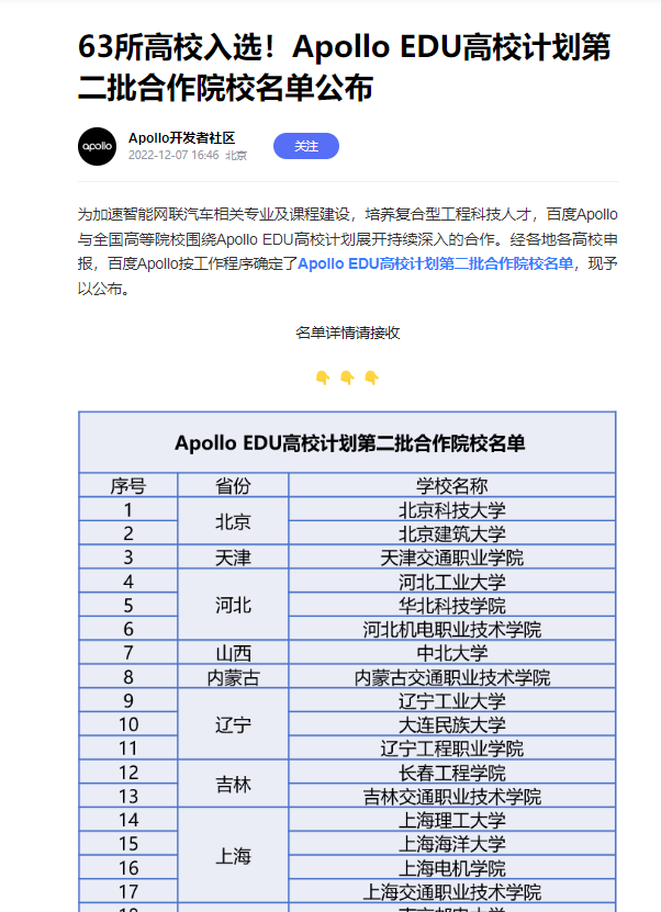 2022年12月7日,百度公布Apollo EDU高校计划第二批合作院校名单,全国共63所院校入选,上海市入选4所院校,十大买球官网在众多申请院校中脱颖而出、成功入选。百度Apollo EDU高校计划旨在通过深度校企合作助力院校开设自动驾驶相关课程及专业,加速人工智能领域工科科技人才的培养进程。