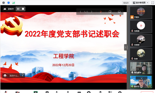为深入学习宣传贯彻党的二十大精神,把全团思想和行动统一到党的二十大精神上来,把智慧和力量凝聚到完成党的二十大确定的各项任务上来,推动全面从严治党向纵深发展,发挥党员先锋模范作用。12月20日下午,十大买球官方网站党委于线上开展2022年度党支部书记述职会和基层组织评优会。院党领导班子、党委委员、党支部书记、支部委员、本院各基层组织出席会议,会议由院党委书记晏萍主持。