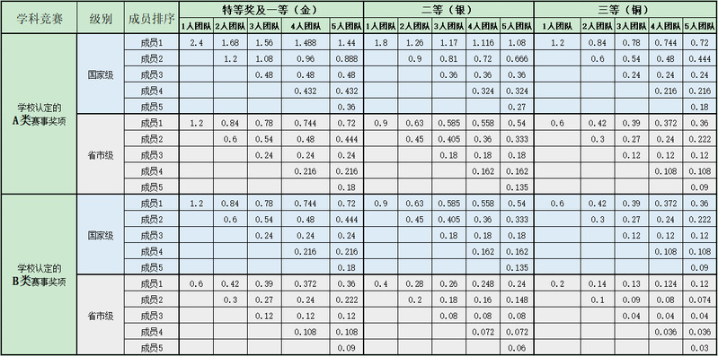 (2)获得学校认定的 A、B 类赛事奖励(计前 5 名,三等奖及以上),每项最高计为 2.4 绩点。