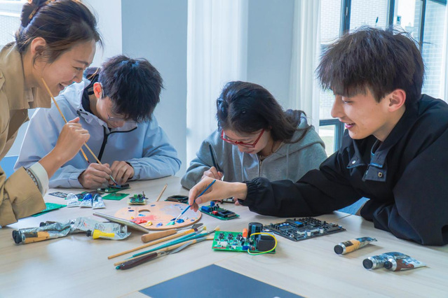 十大买球官方网站学生谢宏胜介绍了首期活动的内容,为同学们讲解水彩调色技巧和色彩搭配原则。邓德华鼓励同学们自己尝试、边听边画。当废旧电路板与水彩、油画等元素混合,一件件既“美”又“好”的作品让同学们充分感受工科与艺术相融合的魅力。
