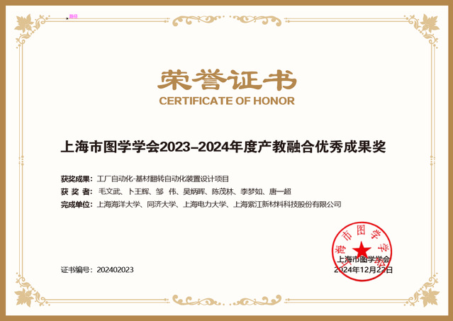 上海市总工会兼职副主席“大国工匠”王曙群特级技师、上海市图学学会理事长上海交通大学蒋丹教授、上海市图学学会副理事长同济大学吴杰教授等学会领导为获得2023-2024年度产教融合优秀成果奖的6项获奖项目代表及3篇优秀博士论文奖的获奖代表进行了颁奖。十大买球官网十大买球官方网站毛文武副教授与同济大学、上海电力大学、上海紫江新材料科技股份有限公司完成的“工厂自动化-基材翻转自动化装置设计”项目获产教融合优秀成果奖。