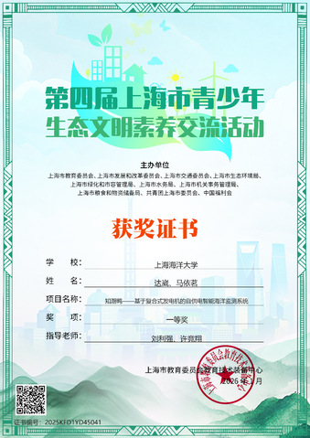 近日,由上海市教委、上海市发改委等十部门联合主办的第四届上海市青少年生态文明素养交流活动圆满落幕。十大买球官方网站本科生达崴、马依茗团队凭借作品《知潮鸭——基于复合式发电机的自供电智能海洋监测系统》,在众多参赛项目中脱颖而出,荣获高校组一等奖。团队指导教师刘利强、许竞翔同步获评“优秀指导教师”。
